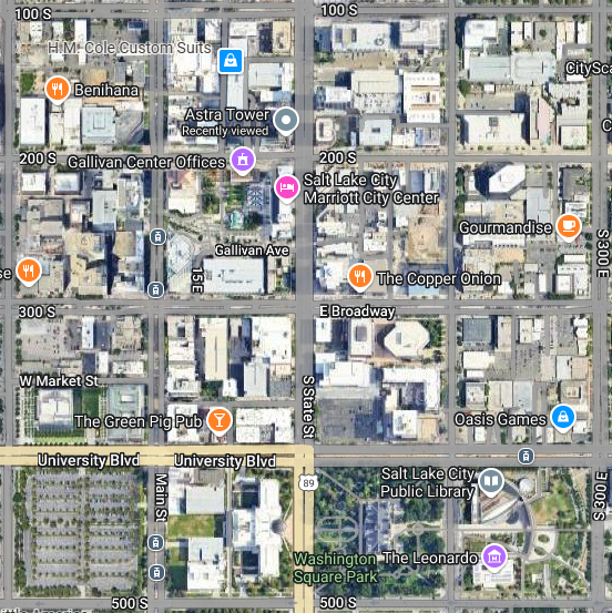 Salt Lake City between West Temple and 300 East and between 100 South and 500 South (see a boundary map here.)